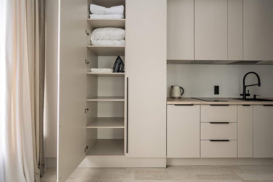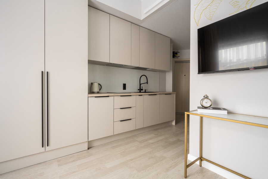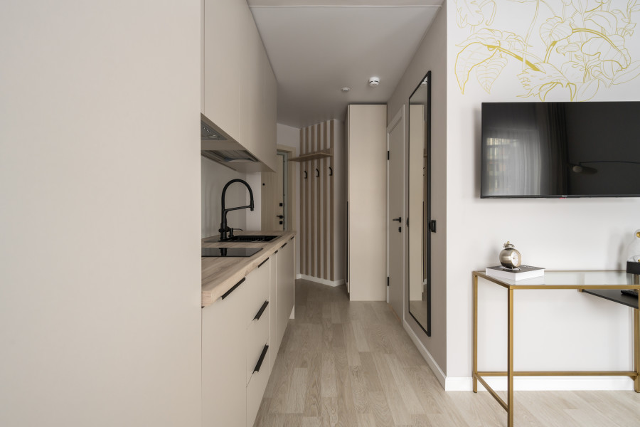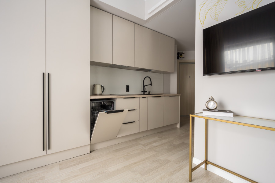 - Оборудование: гладильная доска, кофемашина, микроволновая печь, мини-холодильник, набор посуды, плита электрическая, посудомоечная машина, стиральная машина, телевизор, утюг, электрочайник