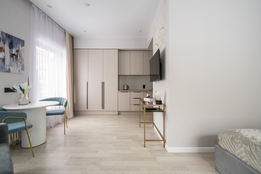 | Студия 4-местная | 30 кв.м. | 4 чел. | Кухня, Мебель (вешалка, диван раскладной, зеркало, кровать двуспальная, прикроватные тумбочки, стол,... |
